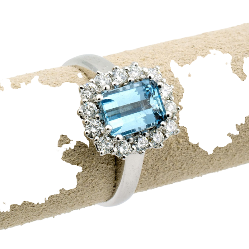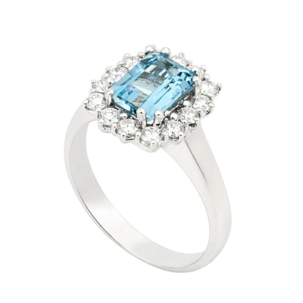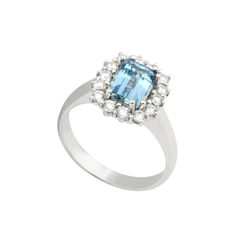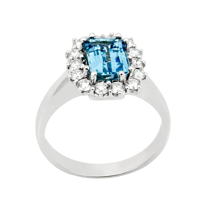 Anello da donna in oro bianco 750/1000 - 18 Kt con 14 diamanti Ct. 0,45 totali e Acquamarina Ct. 1,16